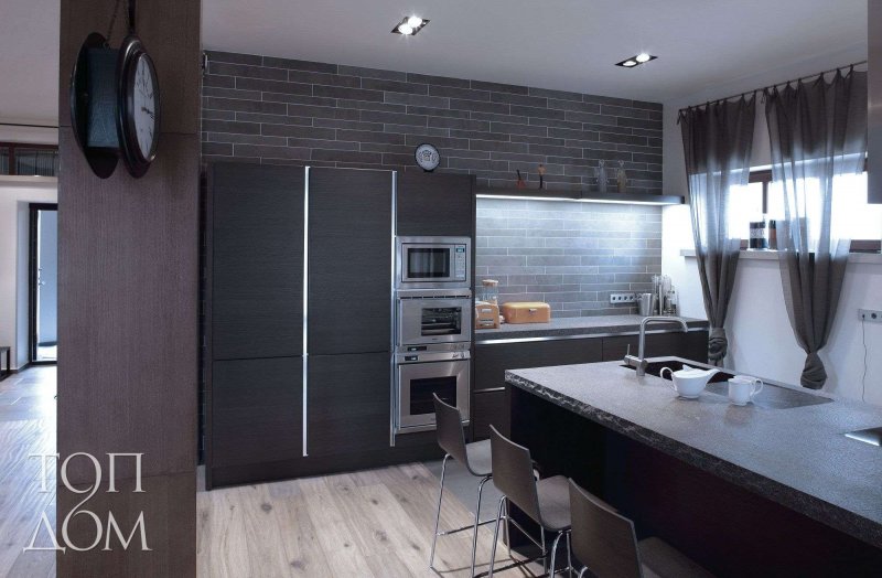 Современный дизайн кухни в стиле хай-тек реализован при ремонте двухуровневой квартиры. В отделке и мебели использованы насыщенные серые оттенки, модели встроенной техники из нержавеющей стали, необработанные края каменной столешницы острова-стойки подчеркивают брутальность. Как и блестящая металлом вытяжка над рабочей зоной.