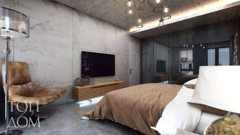 Промышленную эстетику можно удачно вписать в жилое пространство, стиль лофт из дизайна 2-комнатной квартиры – тому подтверждение. В отделке спальной комнаты преобладают грубые фактуры: бетонные стены, пол и потолок, цементные подставки под лампы, необработанная кирпичная кладка за кроватью.