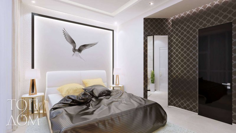 В еще одном проекте стильного дизайна квартиры преобладает белый цвет, благодаря чему заметнее звучат более темные краски. Главной идеей в оформлении спальной комнаты стало сочетание с белым фоном текстиля стального оттенка, темно-коричневой стены с узором в стиле арт-деко и каменной облицовки камина в янтарно-серых прожилках.