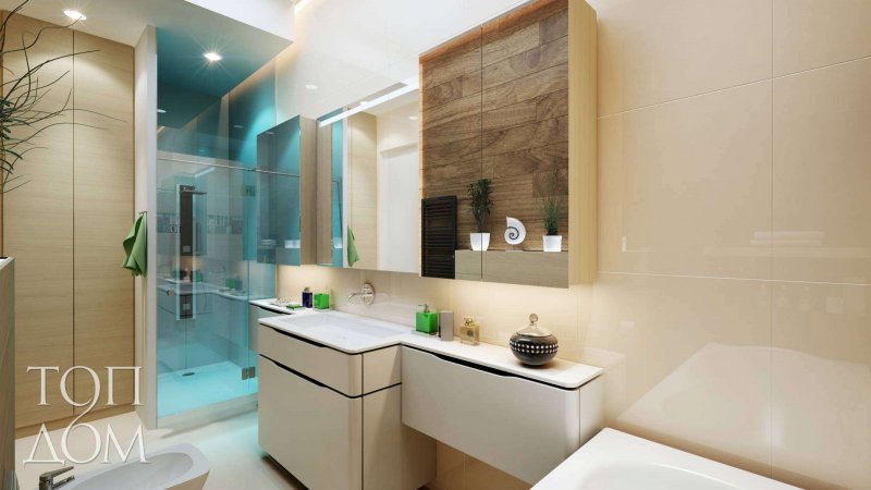 А вот пример оформления небольшого совмещенного санузла из дизайна квартиры на мансарде. Зона туалета спрятана за перегородкой. Остальное пространство упорядочивается цветом и фактурой: керамической плиткой бежевого и коричневого оттенков, рельефной штукатуркой, мозаичным панно.