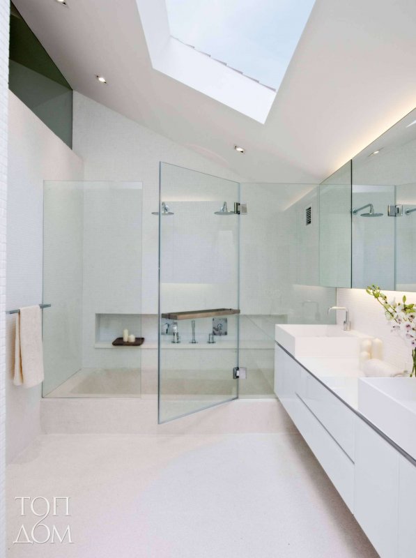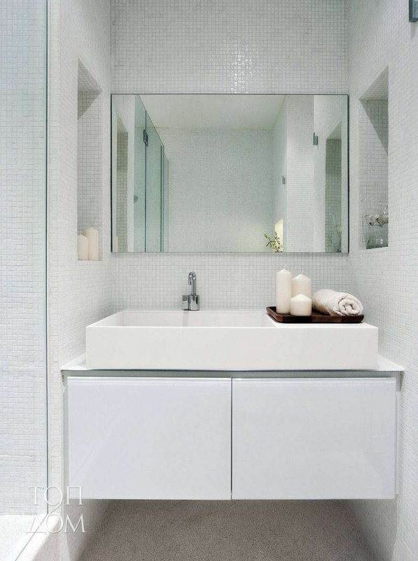 Пример белого оформления – санузел из реализованного ремонта большого дома. Здесь универсальный белый цвет работает основой для свежего, чистого интерьера с минимумом деталей. Белые квадратные раковины сливаются с белым деревом подвесных тумб. Стены облицованы белой мозаикой, за прозрачной перегородкой устроен душевой угол со встроенной нишей для аксессуаров.