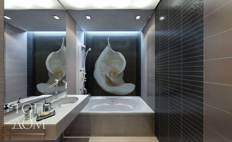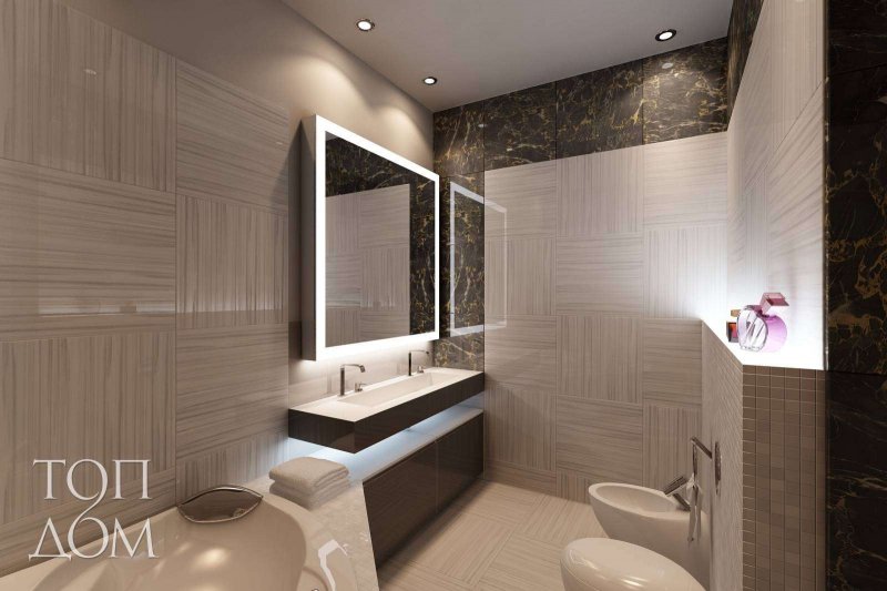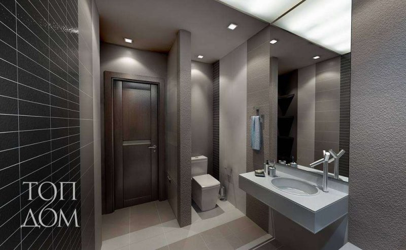 Еще один вариант современного интерьера компактной ванной в дизайне 2-комнатной квартиры. Здесь доминирует светлый серый цвет. Стены, пол и купель облицованы крупной и мозаичной плиткой, серый фон разбавлен для контраста темно-коричневыми участками. Сдвоенная раковина подсвечена снизу и кажется парящей.