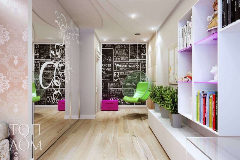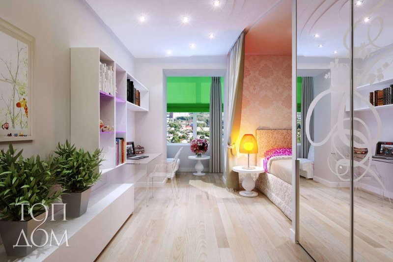 В современном дизайне комнаты для девочки (из проекта уютной квартиры) основной белый цвет удачно сочетается с акцентами: зеленым подвесным креслом, розовой тумбочкой, желтым абажуром лампы, зеленой римской шторой. Помещение вытянуто в длину, это даст возможность логично расположить игровую, спальную, рабочую зоны, на лоджии организовать место отдыха. Шкаф-купе с одной стороны и стенка лоджии образуют нишу для кровати.