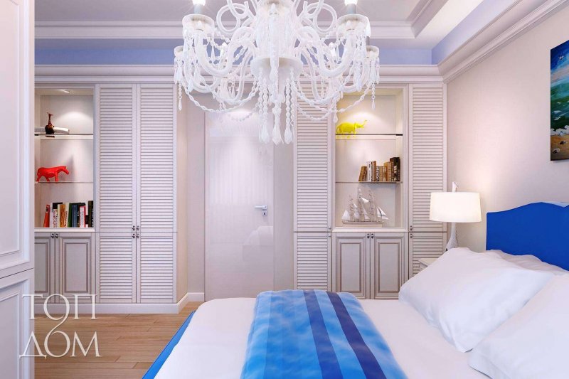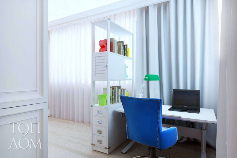 Благородный белый цвет стал фоном и в этой детской (проект квартиры в стиле неоклассики). Контрастными акцентами здесь выступает синий – в текстиле, отделке изголовья кровати, обивке кресла в рабочем уголке. Многочисленные места хранения сочетают глухие фасады и открытые полки, стеллажи.