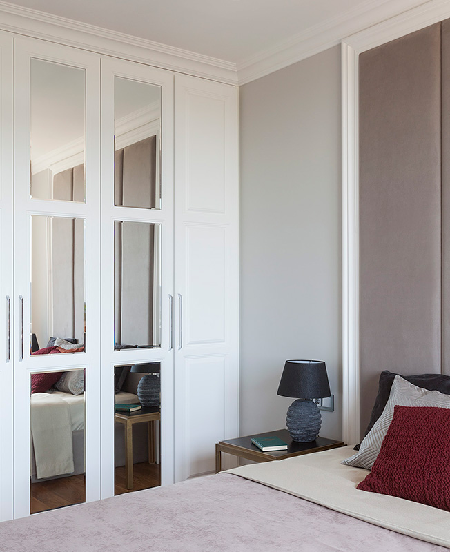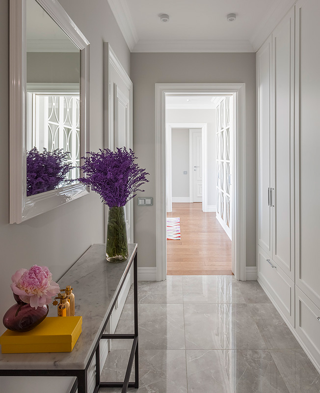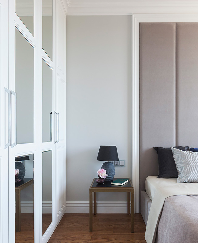 Это хорошо видно на перепланировке: изначально квартира была стандартной планировки (так называемая «распашонка») — длинный коридор, в конце две комнаты. Мы избавились от этого транзитного коридора длиной в 7 метров, увеличили гостиную, зонировали холл, выделили много места для хранения: в гостиной разместили огромный шкаф с зеркальным панно. Панно не только выполняет декоративную функцию в гостиной, но и скрывает за собой много полезных полок».