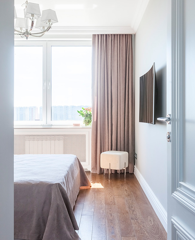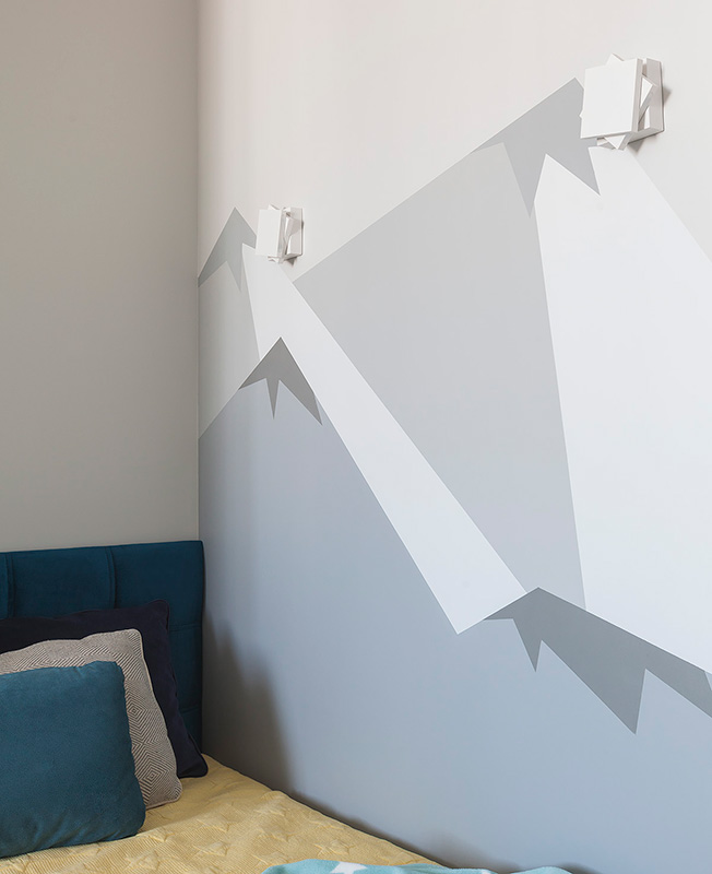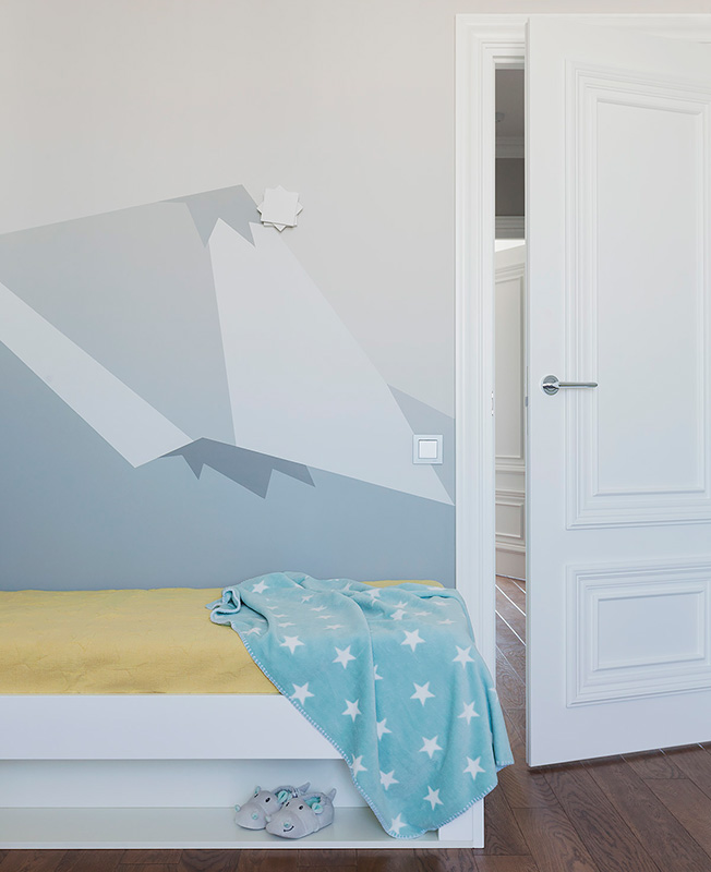 Все стены в квартире окрашены — использовали один цвет. «Благодаря декоративному оформлению каждая комната смотрится по-особенному. Так, например, детскую, чтобы она не выглядела монохромной, мы разбавили графичной росписью и добавили объемные аппликации на стены. В гостиной расставили больше ярких акцентов в текстиле и декоре, чтобы сделать интерьер интересным и необычным. В спальне применили более спокойную палитру.