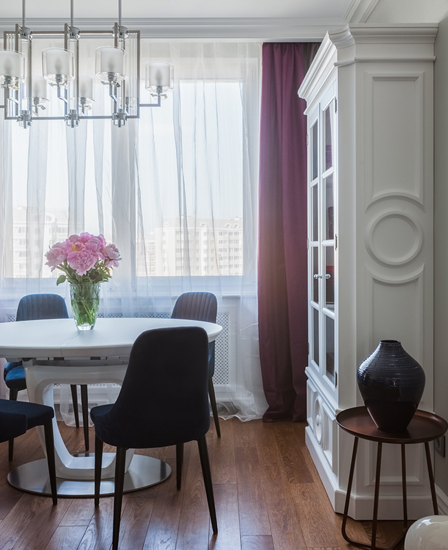 Гостиная-столовая. Буфет Eichholtz. Паркетная доска Finex. На стенах краска Little Greene.