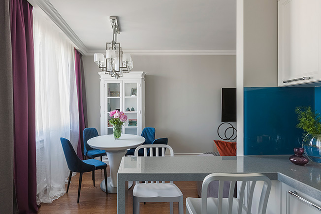 Евгения Филатова спроектировала квартиру для молодой семьи с ребенком. Жилье площадью 85 кв. метров находится на 14 этаже дома в Новой Москве, на улице Анны Ахматовой. Заказчики были уже знакомы с портфолио дизайнера и хотели получить интерьер в духе ее предыдущих работ. Гостиная-столовая. Диван Massimo Mebel. Журнальные столики Crate and Barrel. Паркетная доска Finex. На стенах краска Little Greene. Картина — работа автора проекта. Работать пришлось с уже существующей планировкой, которую не было возможности кардинально изменить, но пространство постарались использовать максимально эффективно. «Главной задачей было сделать комфортно, уютно, стильно и функционально, — рассказывает Евгения Филатова. — Когда каждый квадратный метр работает и задействован, нет глухих углов и проходных зон — проект был сделан правильно. nonenonenonehttps://www.filatova-design.ru/ Вид на зону кухни из гостиной-столовой. Кухня — столярное производство. Гостиная-столовая. Диван Massimo Mebel. Журнальные столики Crate and Barrel. Паркетная доска Finex. На стенах краска Little Greene. Картина — работа автора проекта. Гостиная-столовая. Диван Massimo Mebel. Паркетная доска Finex. На стенах краска Little Greene. Гостиная-столовая. Буфет Eichholtz. Паркетная доска Finex. На стенах краска Little Greene. Это хорошо видно на перепланировке: изначально квартира была стандартной планировки (так называемая «распашонка») — длинный коридор, в конце две комнаты. Мы избавились от этого транзитного коридора длиной в 7 метров, увеличили гостиную, зонировали холл, выделили много места для хранения: в гостиной разместили огромный шкаф с зеркальным панно. Панно не только выполняет декоративную функцию в гостиной, но и скрывает за собой много полезных полок». Вид на зону столовой из кухни. Буфет Eichholtz. Кухня — столярное производство. Все стены в квартире окрашены — использовали один цвет. «Благодаря декоративному оформлению каждая комната смотрится по-особенному. Так, например, детскую, чтобы она не выглядела монохромной, мы разбавили графичной росписью и добавили объемные аппликации на стены. В гостиной расставили больше ярких акцентов в текстиле и декоре, чтобы сделать интерьер интересным и необычным. В спальне применили более спокойную палитру. «Очень жалко было ребят, которые заносили стеклянный фартук на 14 этаж по лестнице: 3 метра длина стекла. Подняли, занесли в квартиру, а оказалось, что стекло покрасили не с той стороны — перепутали на производстве». В данном проекте мне особенно нравится цветовая гамма и сочетание всех предметов мебели в детской. Использовались пастельные цвета, удалось обойтись без синего, но при этом с полной уверенностью можно сказать, что это комната для мальчика». По словам Евгении, первым пожеланием заказчиков было «только не серое». «Забавно вышло, но при выборе плитки, краски, текстиля, мебели мы все равно возвращались в серую цветовую гамму. а что получилось — видно по фото, — смеется дизайнер. — Мы каждый раз с заказчиками вспоминали и шутили на эту тему». Спальня родителей. Кровать с эффектным изголовьем исполнили мастера компании A