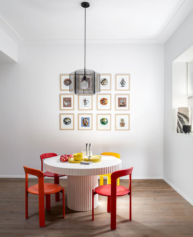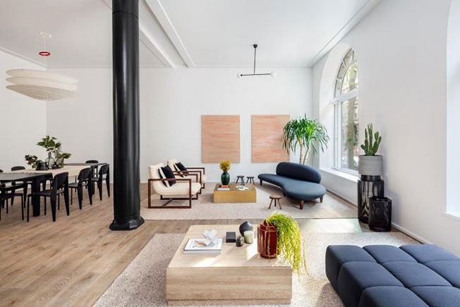 В интерьере — микс дорогих и стандартных предметов. На фоне нейтральной цветовой палитры авторы разместили яркие вещи от Hay и Ikea, обеспечив таким образом функциональную базу интерьера. Эстетику дизайнеры привнесли с помощью объектов знаменитых модернистов: диван Исаму Ногучи, журнальный столик из травертина Пола Мак-Кобба, кресло Flag Ханса Вегнера. Завершили образ парадной части абстрактные полотна американского художника Пола Майкла Грейвса.