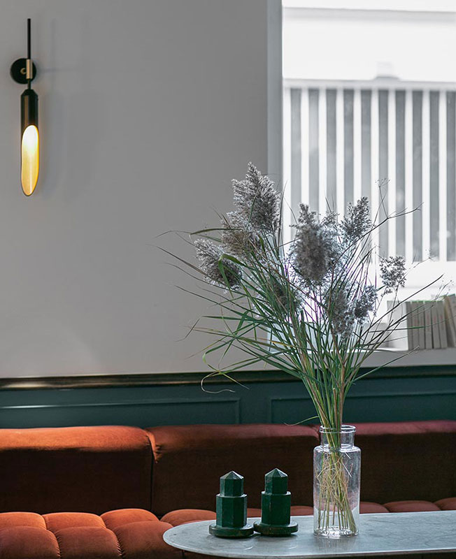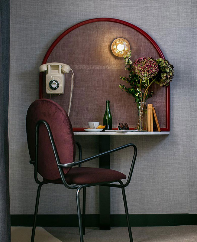 Этажи соединяет оригинальная лестница, теперь восстановленная в прежней славе. Изогнутые линии и бархатные изголовья напоминают о влиянии французского ар-деко и о похожих композициях отелей Доротеи Мейлихзон, винтажные телефоны, сухие букеты и новые светильники, спроектированные дуэтом в ретро-манере, добавляют завершающий штрих изощренной ностальгии.