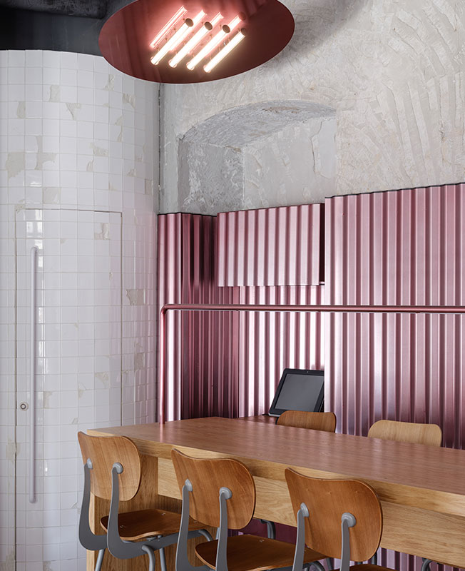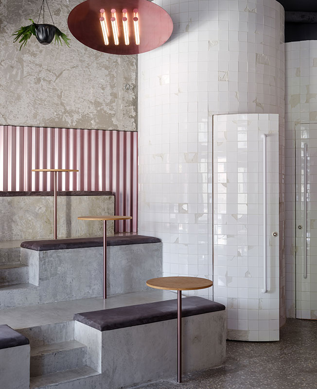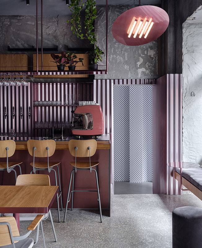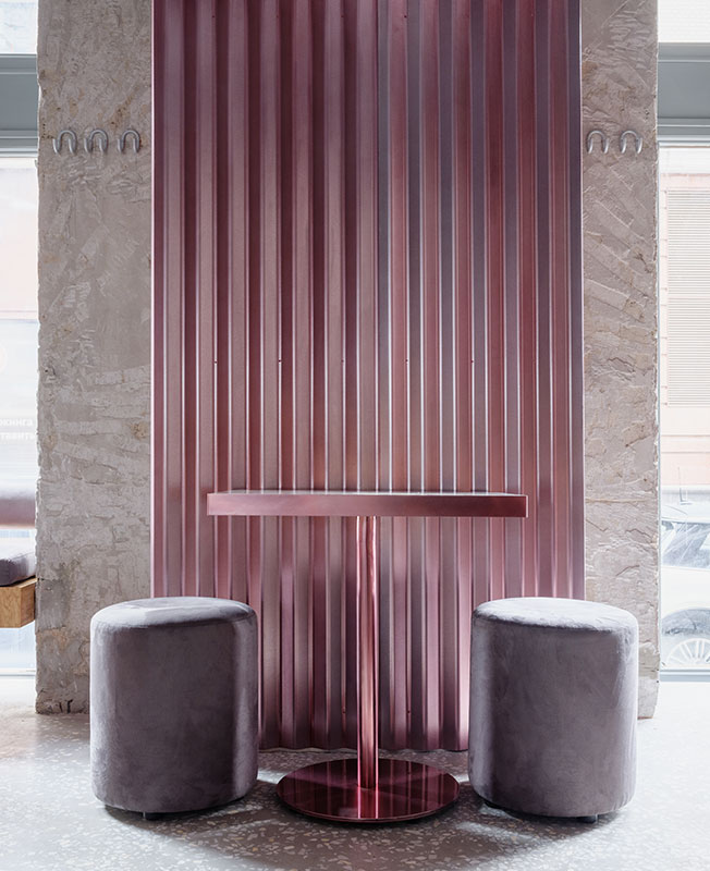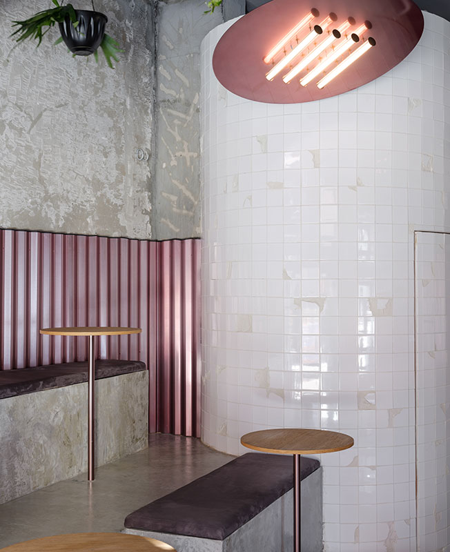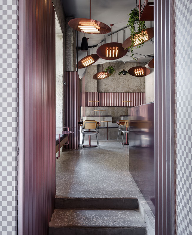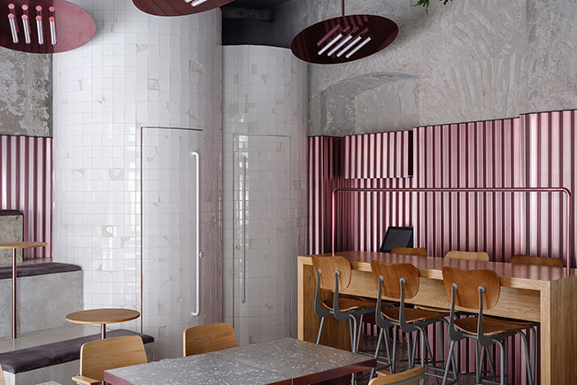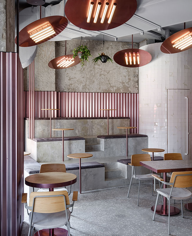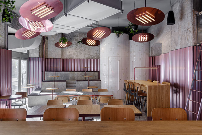 Мои проекты нередко визуально контрастируют с назначением пространства. В данном случае мне хотелось создать ощущение двора, по типу тех, что есть в Venice в Лос-Анджелесе. Стендовые панели похожи на забор, а лампы — на обогреватель. В этом дворе всегда тепло, весело и вкусно. Ты чувствуешь себя раскованно, молодо и сексуально.