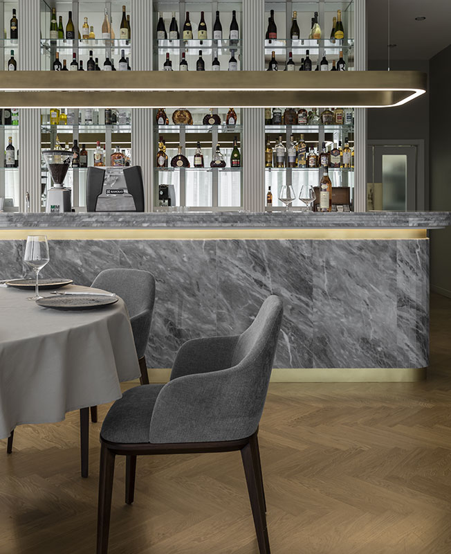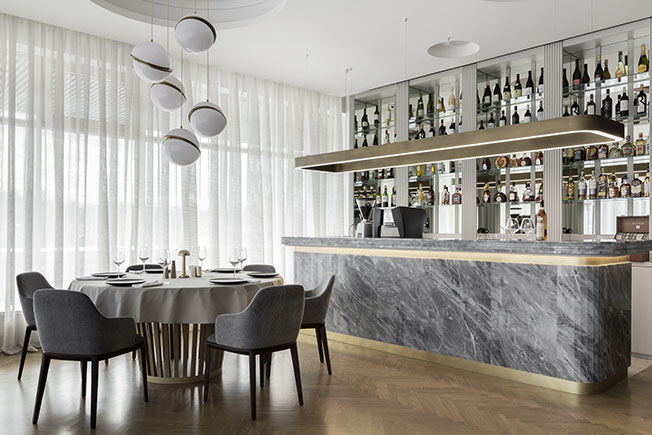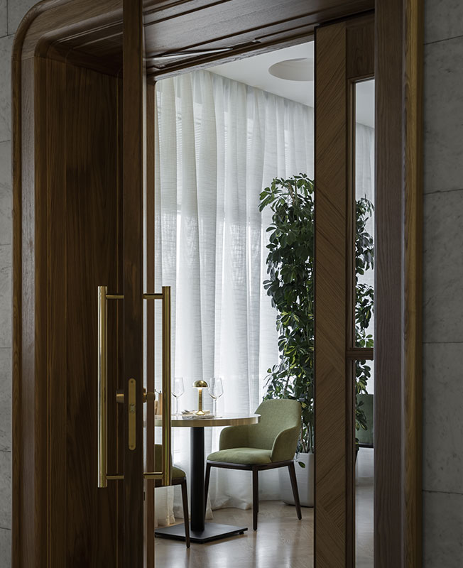 Для оформления использовали дорогие материалы — мрамор, латунь, красивый текстиль. Практически весь интерьер состоит из элементов, созданных по эскизам архитекторов, начиная от входной двери и встроенной мебели, и заканчивая баром и декоративным светильниками.