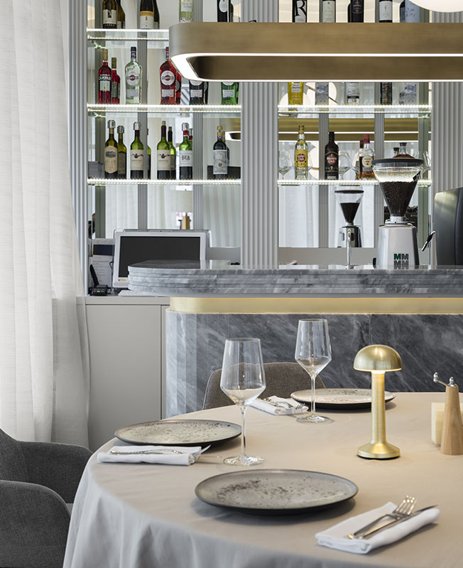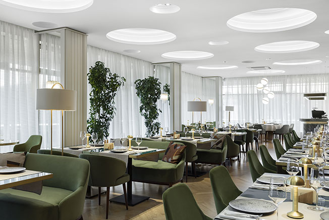 Новый ресторан площадью 150 кв. метров находится на втором этаже угловой части модернистского здания 70-х годов. Из его окон и с террасы открывается живописный вид на парк и окрестности.
