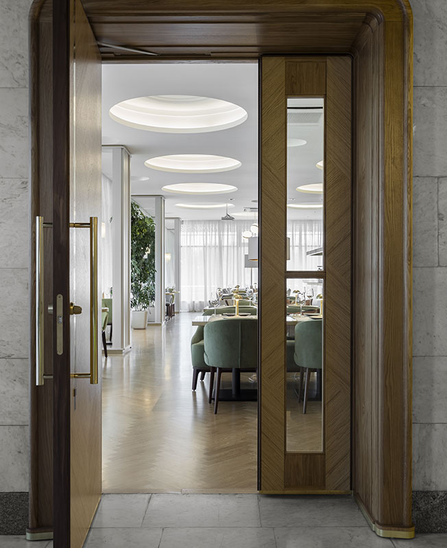 Задачей было предусмотреть вариант трансформации общего зала в длинный банкетный, а в утренние часы предусмотреть дополнительные места для сервировки завтраков.