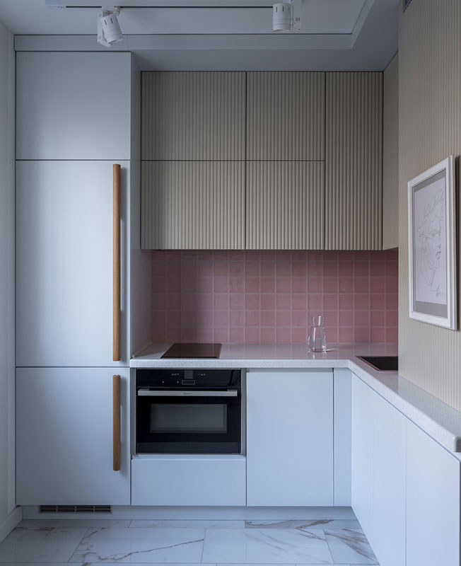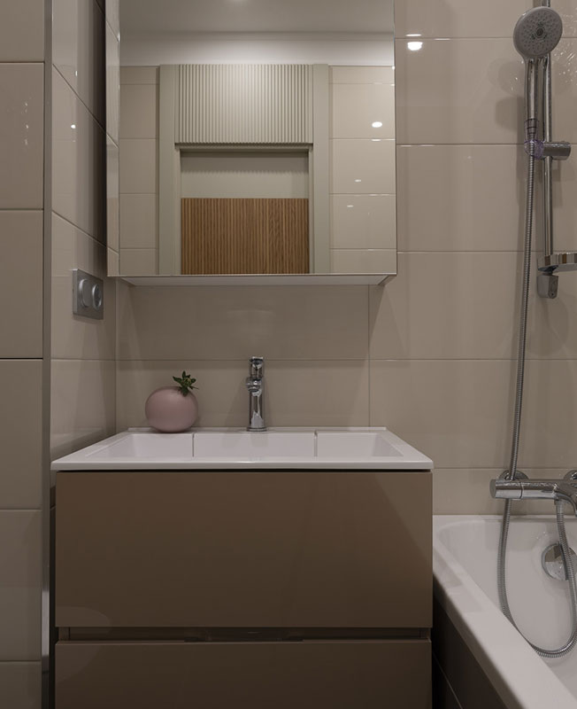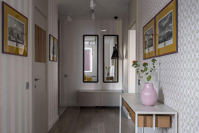 Компактная типовая квартира в Москве площадью 32 кв. метра всегда ставит задачи перепланировки. Но на этот раз было по-другому. Архитектор Игорь Куркин должен был, не меняя плана, разместить на этих скромных метрах все необходимое. nonenonehttps://www.facebook.com/people/Игорь-Куркин/100008026909232none Квартира находится в типовом панельном доме 1990-го года. В пространство не было внесено никаких кардинальных изменений, дизайнер лишь убрал дверь на кухню, чтобы объединить ее с зоной прихожей и коридором. Фрагмент коридора. Ваза на консоли, зеркала, тумба в прихожей, Ikea. Чтобы визуально расширить пространство, кухню было решено оформить в светлой палитре. Игорь подошел очень бережно к каждому сантиметру площади этой комнаты. Из мебели он выбрал визуально невесомый стеклянный стол из Ikea, не утяжеляющий интерьер. Поддерживает идею легкости и воздушный дизайнерский светильник Bolle — от англо-итальянского дуэта Giopato