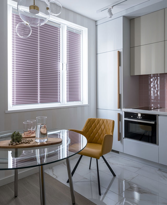 Обеденный стол, Ikea. Светильник Bolle, диз. Giopato & Coombes. Желтая обивка стульев, розовая плитка фартука и жалюзи разбавляют стерильность кухни и привносят в нее частичку теплоты и уюта.