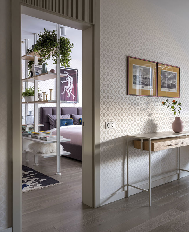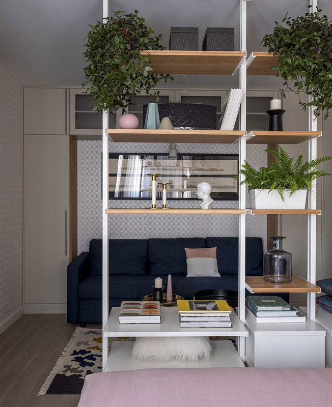 Кухонная зона плавно переходит в прихожую, которая в свою очередь перетекает в гостиную. Эффект непрерывной жилой зоны создается за счет настенного покрытия, которое использовалось для обоих пространств. Стеллаж разделяет гостиную на две функциональные зоны. В глубине комнаты расположено спальное место с полноценной кроватью. Из-за недостатка места туалетный столик пришлось вынести в коридор и заменить его лаконичной консолью.