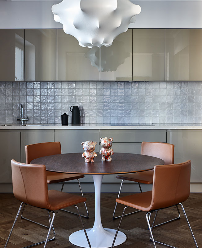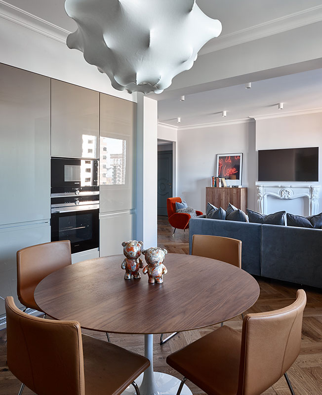 Вид из гостиной на зону кухни. Краска на стенах, Little Green, Manders. Диван, Ikea. Заказчики, пара с маленьким ребенком, хотели в пространстве своей московской квартиры обязательно объединить гостиную и кухню, организовав просторную рабочую зону, т.к. семья любит готовить. И, конечно, оборудовать просторную гардеробную и постирочную-кладовую. Проект реализовала дизайнер Вера Савельева. nonehttps://www.instagram.com/verasavelieva/https://www.facebook.com/TheElementsOfStyleStudio/http://www.st-elements.com/ При достаточно удачной общей планировке, квартира имеет существенный недостаток — относительно низкий, по современным меркам, потолок (2,65 м). Потому было решено отказаться от сложных декоративных элементов в оформлении стен и потолка: люстру в гостиной не планировали, оставили ее только над обеденным столом. Кухня. Обеденная группа, Ikea. Люстра Taraxacum 2, Flos. Керамические мишки, художник-керамист Елена Орехова. Выбор пал на знаменитый объект Taraxacum 2 (Cocoon) по дизайну Пьера Джакомо и Акилле Кастильони. Светильник стал одним из первых, произведенных фабрикой Flos в начале 1960-х. Синтетическую смолу в виде спрея наносили на металлический каркас, в результате получались легкие осветительные приборы в технике «кокона». Кухонный гарнитур выполнен на заказ по эскизам дизайнера, столярное производство. «С самого начала я предложила не привязываться к каким-то стилистическим штампам. Дом — не музейное пространство. Я создавала пространство не в духе ар-деко или классики, но стремилась получить гармоничный легкий интерьер, не перегруженный декором», — рассказывает дизайнер. Гостиная. Комоды, Ikea. Ковер, H