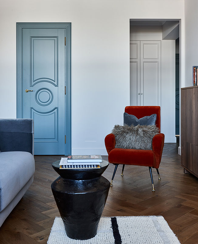 Фрагмент гостиной. Двери выполнены на заказ по эскизам дизайнера, столярное производство. Пол, Finex. Винтажное кресло, 1960-е, Repeatstory. Керамический столик ручной работы, художник-керамист Елена Орехова.