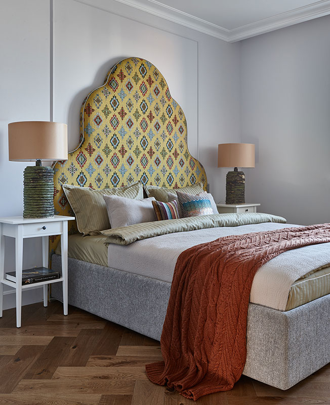 Самым эффектным предметом интерьера стала кровать с высоким фигурным изголовьем в английской ткани с ориентальным рисунком. Вдохновением к созданию такого яркого объекта послужили интерьеры дизайн-отелей Firmdale Hotels. Декоратор Кит Кемп (Kit Kemp) оформляет номера и лобби, используя традиционные английские формы и красочные текстуры.