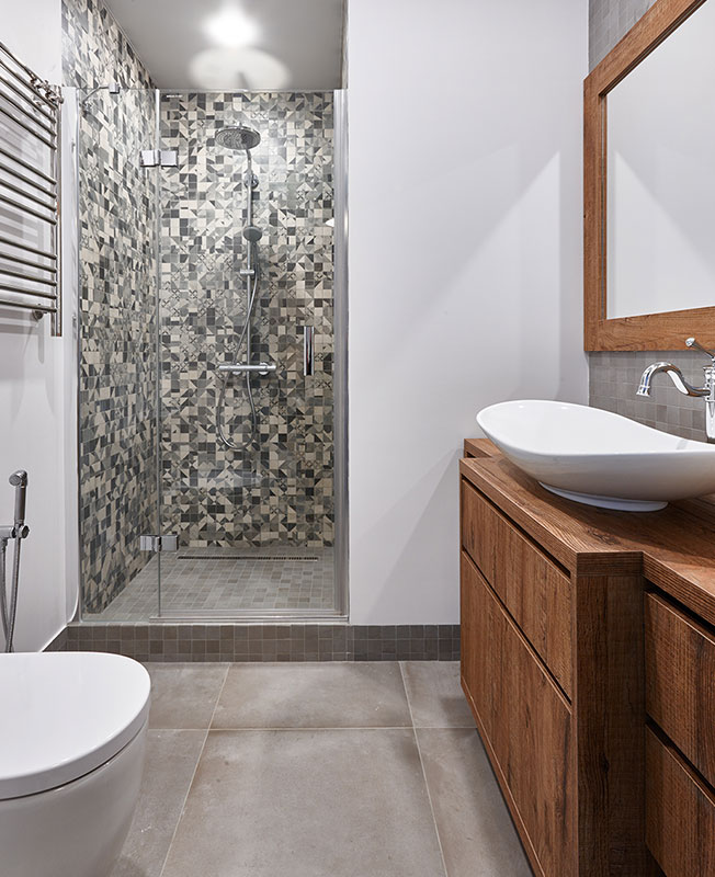Душевая. Раковина, Villeroy & Boch. Керамогранит, мозаика, FAP. Мебель, зеркало выполнены на заказ по по эскизам дизайнера, столярное производство.