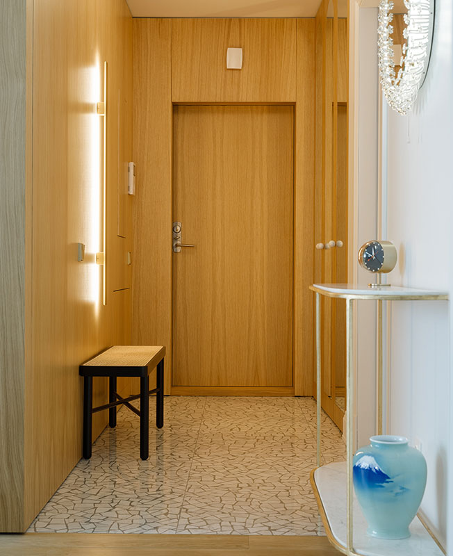 Небольшую прихожую полностью отделали шпонированными панелями — таким образом образом скрыли электрощит и шкаф для обуви. Маленькое некрасивое помещение превратилось в симпатичную «шкатулку».