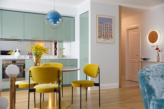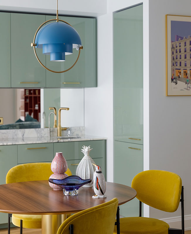 «Мы хотели создать красочный интерьер. С точки зрения палитры у нас было несколько образующих элементов: шалфейного цвета кухонные фасады от Ikea и ткань Dedar, которой обито кресло Gubi. Остальные оттенки и цвета подтянулись, чтобы «собраться в букет».