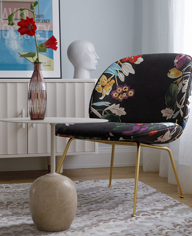Новая обивка от итальянского бренда Dedar изменило образ датского кресла Gubi. Столик &tradition дизайна Луки Никетто.