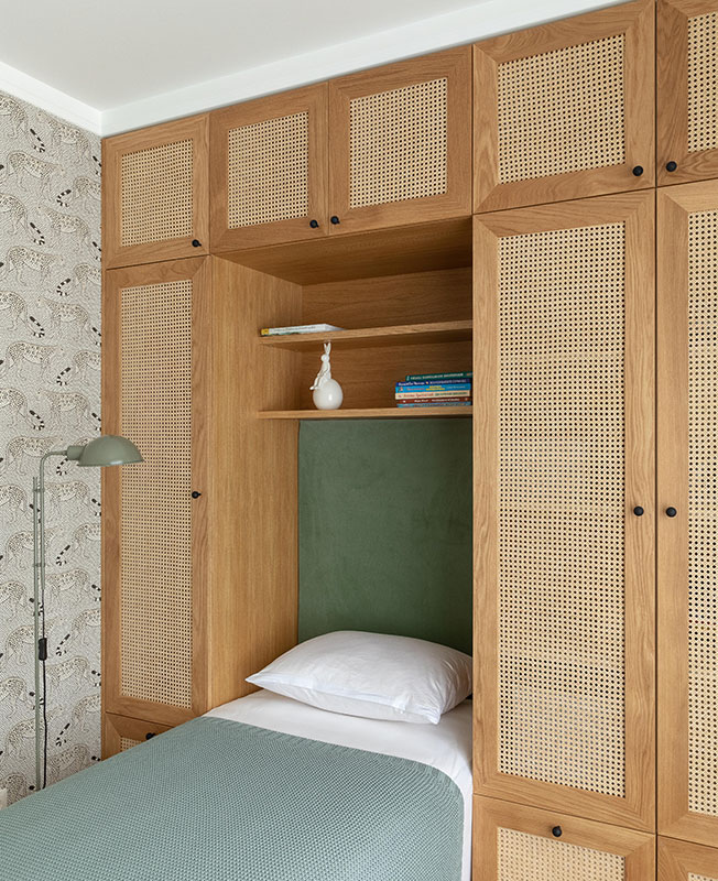 Для детских изготовили на заказ системы хранения, в которых использовали шпон дуба сетку из раттана. Такая отделка задает колониальную тематику, ее поддерживают обои Cole & Son: у мальчика с леопардами, у девочки — с фламинго.