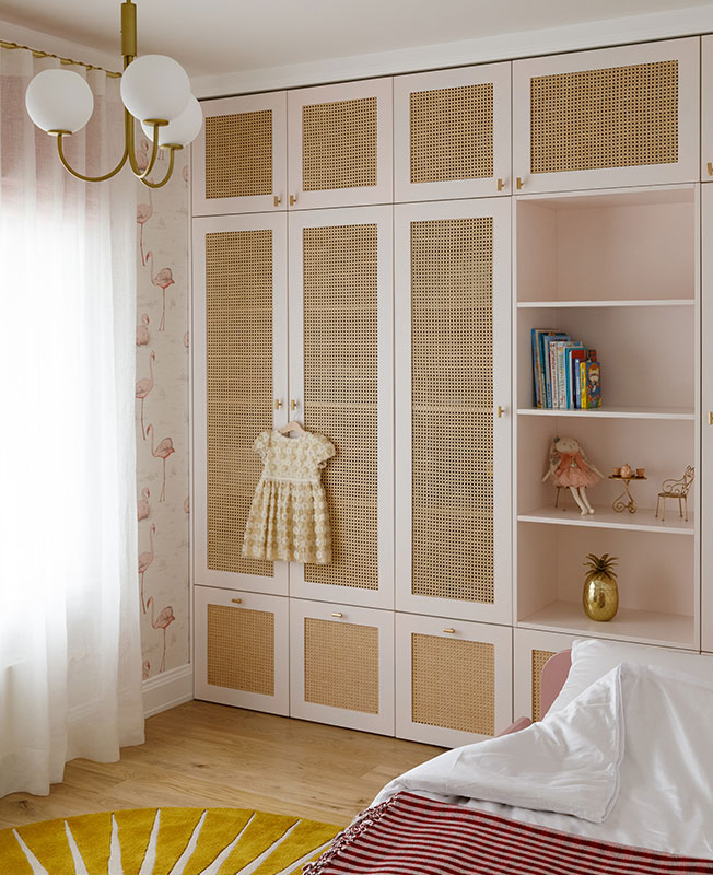 Комната девочки. Шкафы изготовлены на заказ, в фасадах использована сетка из раттана. Cтены отделаны обоями Cole & Son.