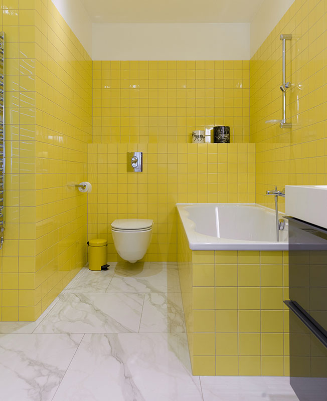 Детский санузел сделали ярко-желтым. Простая плитка размером 10 х 10 см выглядит стильно и благородно.