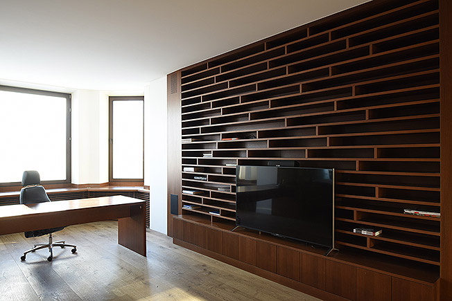 Стеллаж в гостиной придуман для горизонтального хранения книг, поскольку в вертикальном положении книги, по мнению архитектора, коробятся. Вся авторская мебель в квартире выполнена из дуба.