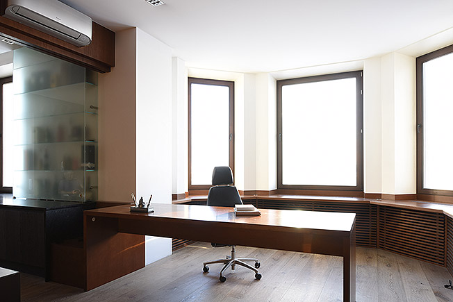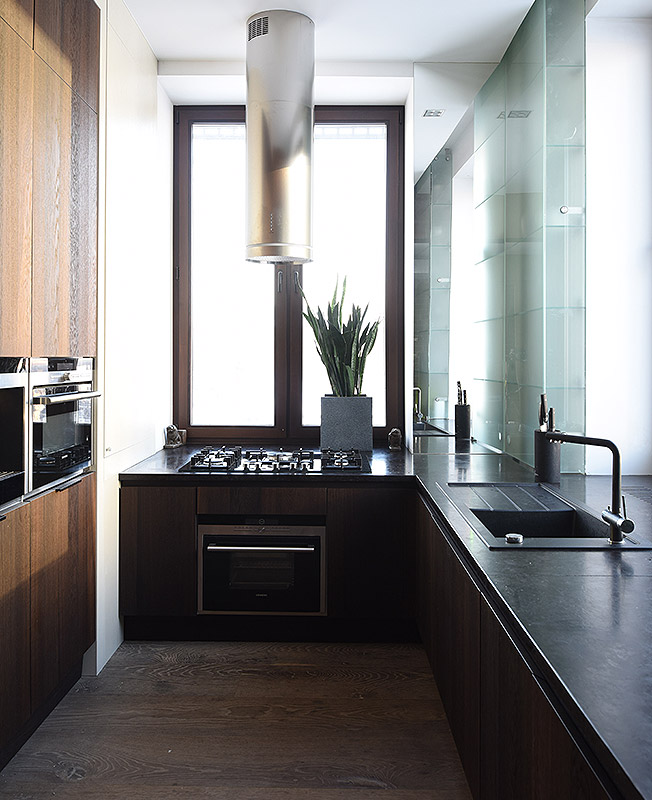 Столешницу в кухне продолжает рабочий стол в гостиной — получилась поверхность длиной во всю квартиру. Вместо занавесок на окнах — матовые стеклянные панели.