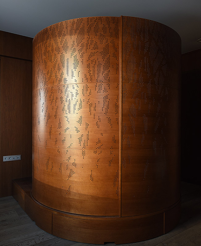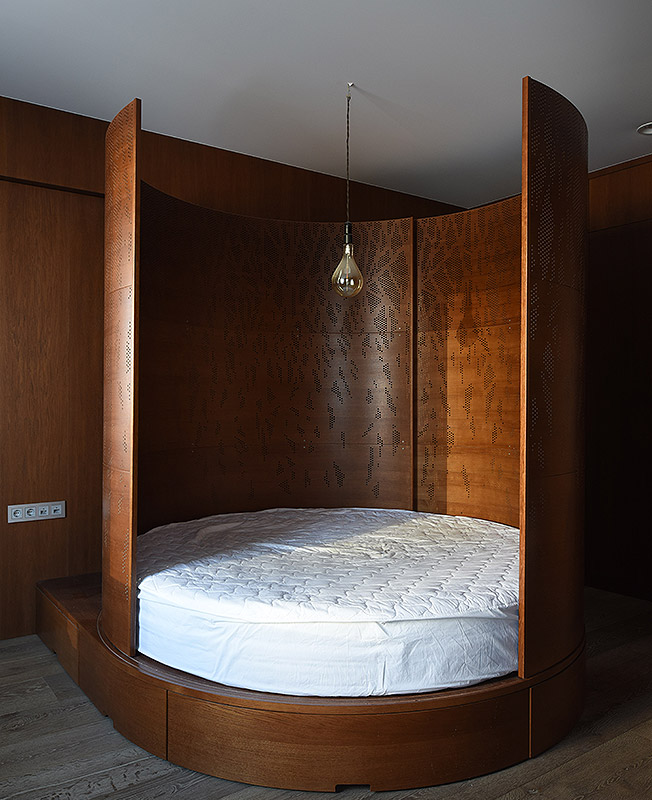 Спальню не хотелось показывать — придумал круглую перегородку для кровати, получился этакий цилиндр. Чтобы зрительно облегчить его, нарисовал узор в виде леса. Там несколько тысяч дырочек, и каждую мастер сверлил с двух сторон, чтобы аккуратно было. Полгода ушло на этот цилиндр. В прошлой моей квартире вещи было некуда девать. Человек копит-копит вещи, они вроде не нужны, а выбросить жалко. Мне всегда нравились японские закрытые системы хранения, и в этой квартире я сделал все стены из шкафов. Туда можно убрать вещи, чтобы не мешали думать. Правда, шкафы пока стоят пустые, мусор еще не набился. Есть и неудобство — картину повесить негде.