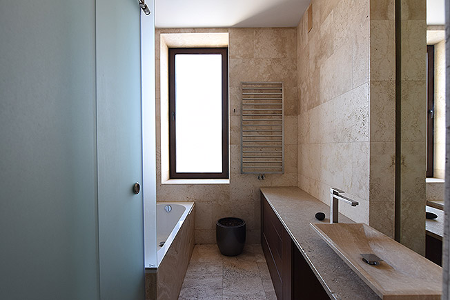 Зеркальная перегородка между ванной и туалетом очень кстати, когда приходят гости. В остальное время она открыта, можно использовать естественный свет из окна в ванной.