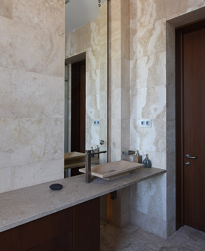 «Это была сталинская квартира с длинным коридором, черным ходом и паркетом елочкой. Я хотел сохранить аутентичность планировки, но жена сказала «нет». Коридор забирал пространство, поэтому мы его убрали. У меня много друзей, и я сделал побольше места для гостей. Стеллажи в гостиной были придуманы так. Я всегда покупал много книг, но не знал, как их хранить. В вертикальном положении они коробятся. Придумал горизонтальное хранение. Но из стопки книгу вынимать неудобно. Поэтому ячейки сделаны такого размера, чтобы положить три, от силы пять книг или журналов. Не все пригодилось из того, что я сделал в квартире. Например, раздвижная перегородка между общественной и частной зонами оказалась не нужна. А вот зеркальная между ванной и туалетом очень кстати, когда приходят гости. В остальное время она открыта, можно использовать естественный свет из окна в ванной.