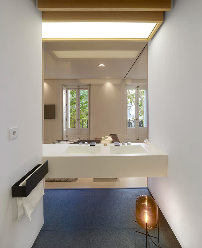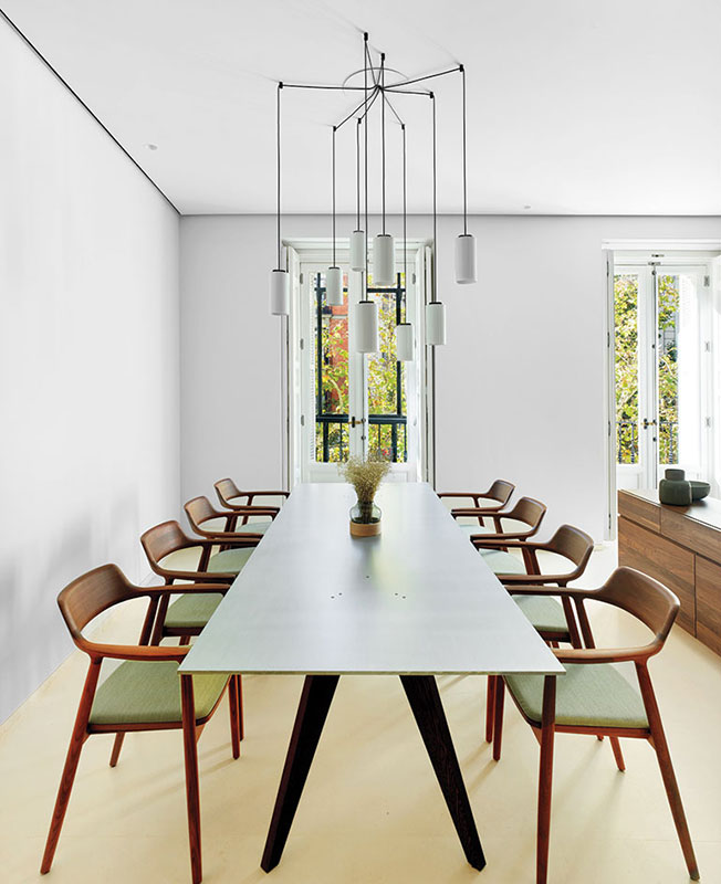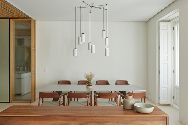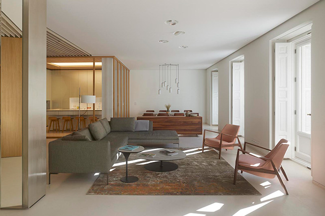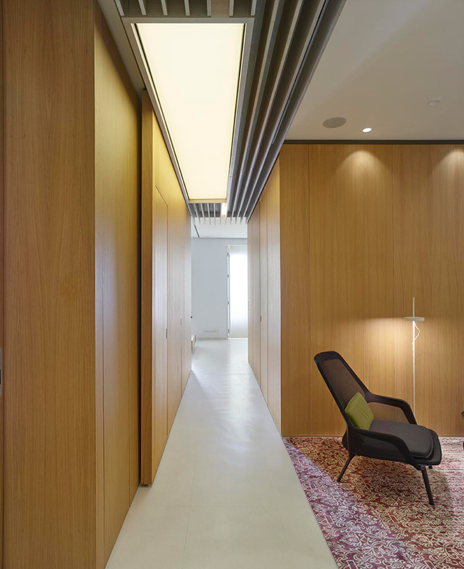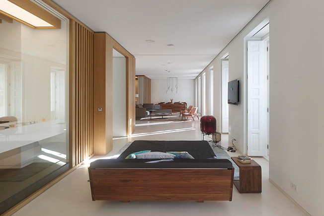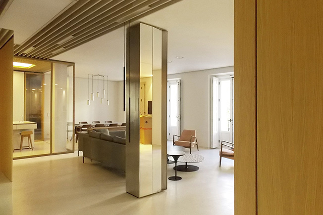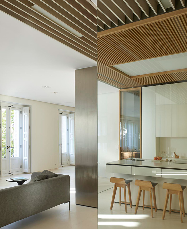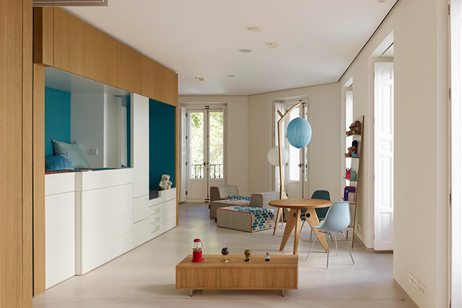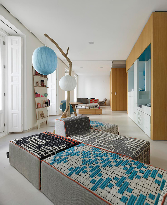 Маркус Лассан и Соня Симон Матео, u_labprojekte, превратили пространство бывшей школы в Мадриде в современное жилье площадью с раздвижными перегородками и удобным разделением на зоны. Планировку на 300 кв. метров полностью изменили, не затрагивая несущие конструкции. Результатом стало открытое и свободное пространство, наполненное светом и воздухом. Чтобы зонировать помещение и скрыть конструктивные элементы, в нем выстроили четыре деревянных модуля, в которых разместились кухня, ванные комнаты, гардеробная. Благодаря большой площади остекления модули обеспечены естественным светом. Раздвижные перегородки позволяют разделить площадь квартиры на шесть зон: гостиную, спальню, детскую комнату, спальню бабушки, комнату для гостей и служебное помещение. Когда перегородки сдвинуты, каждая зона образует автономное пространство, состоящее из спальни или гостиной со своей ванной. Так все пространство можно использовать очень гибко.