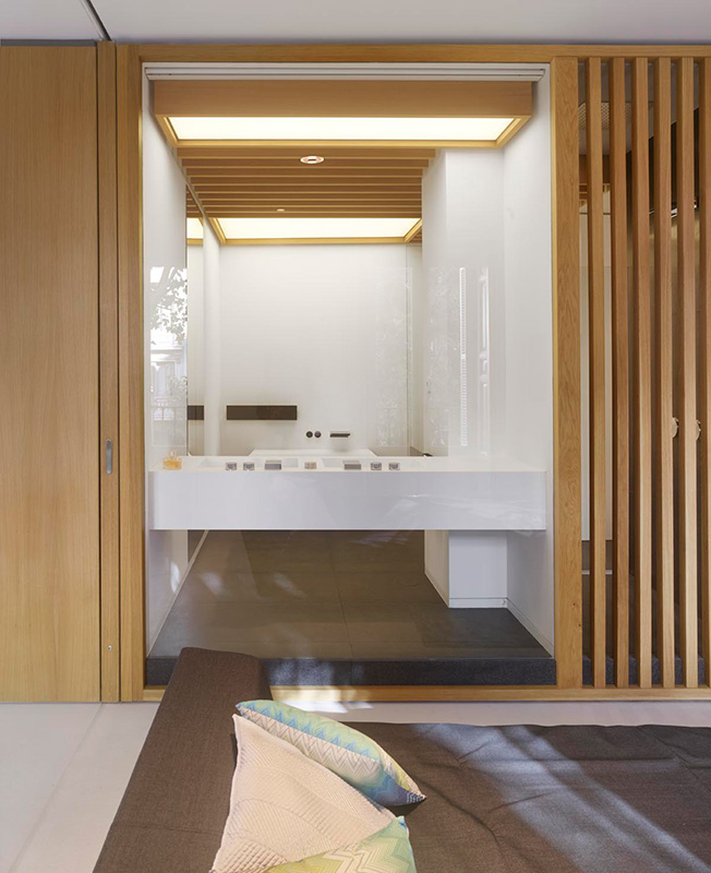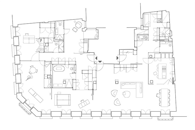 Раздвижные перегородки позволяют разделить площадь квартиры на шесть зон: гостиную, спальню, детскую комнату, спальню бабушки, комнату для гостей и служебное помещение. Когда перегородки сдвинуты, каждая зона образует автономное пространство, состоящее из спальни или гостиной со своей ванной. Так все пространство можно использовать очень гибко.