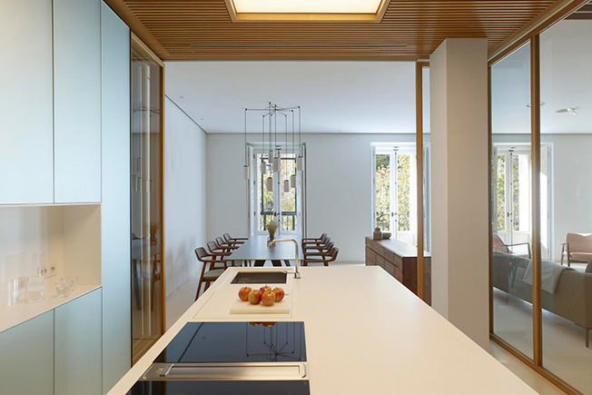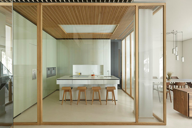 Планировку на 300 кв. метров полностью изменили, не затрагивая несущие конструкции. Результатом стало открытое и свободное пространство, наполненное светом и воздухом. Чтобы зонировать помещение и скрыть конструктивные элементы, в нем выстроили четыре деревянных модуля, в которых разместились кухня, ванные комнаты, гардеробная. Благодаря большой площади остекления модули обеспечены естественным светом.