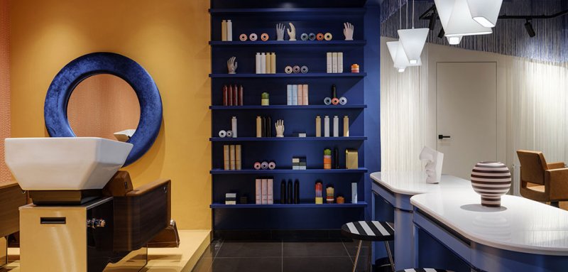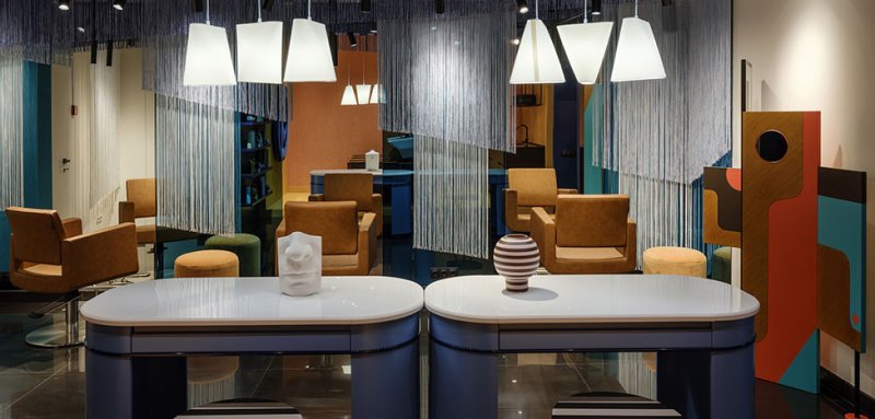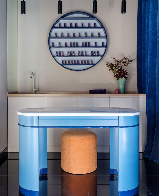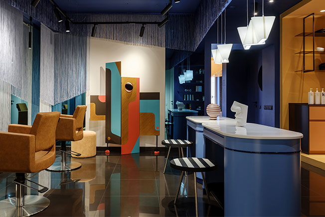 Заказчики, молодая пара, решили открыть салон красоты бизнес-класса для людей высокого достатка. Для реализации задуманного пригласили дизайнеров Анастасию Пугачевич и Андрея Сайко (Pugachevich studio). Владельцы особых пожеланий к концепции не выдвигали, но были решительно против «стиля лофт». Более того, придумать название салона (Corso) и разработать фирменный стиль собирались уже непосредственно под интерьер. nonehttps://www.instagram.com/pugachevich_studio/https://www.facebook.com/PugachevichStudio/?ref=bookmarkshttp://pugachevich.studio/ Раньше на этом месте располагался свадебный салон. «В наследство нам достался темный пол и две большие потолочные ниши в зоне ресепшн. В них мы расположили предметные доминанты — светильники с разноуровневой бахромой», — рассказывают дизайнеры. Временные рамки и бюджет проекта были весьма ограничены — от перекрашивания пола сразу отказались, об изменении конструктивных особенностей потолка тоже речи не шло. В основе концепции проекта — интрига, преображение. «Мы конструировали нарочито театральный интерьер, ведь посетить салон красоты и получить новый образ — все равно что примерить маску или сыграть роль. Зона мойки головы также создана в духе театра с помостом-подиумом». Второй яркой особенностью интерьера стала бахрома, символизирующая водопад красивых волос. На создание пространства дизайнеров вдохновила стилистика 60-70-х годов с изобилием декоративных акцентов: бахрома, множество зеркал, разнообразные фактуры, градиенты и жизнерадостная цветовая палитра. В интерьере многократно повторяется форма круга. Функционально помещение 100 кв. метров разделили на две зоны. Первая — ресепшн, небольшое подсобное помещение и зал стилистов, вторая — косметический и педикюрный кабинеты, которые были отстроены буквально заново. Наибольшим изменением подвергся зал стилистов. Дизайнеры возвели в зоне мойки головы специальный подиум, который скрывает водопроводные коммуникации. Практически все предметы интерьера (за исключением профессионального оборудования) были созданы на заказ. Для салона подобрали нетипичную смелую цветовую палитру с wow-эффектом. Потолок оформили в насыщенном синем оттенке, перекликающимся с темным полом. Цвет успокаивает, не раздражает, не угнетает. Контрастными акцентами доминирующему синему стал оранжевый оттенок в светильниках и креслах. «С центральной люстрой в зоне ресепшн связана забавная история. Перед заказом мы решили изготовить макет светильника из гофрокартона. Собрали макет в офисе, привезли на объект. Смонтированный на потолке он провисел ровно три минуты. Мы удостоверились, что все размеры совпадают — и картонная люстра с грохотом упала на пол».