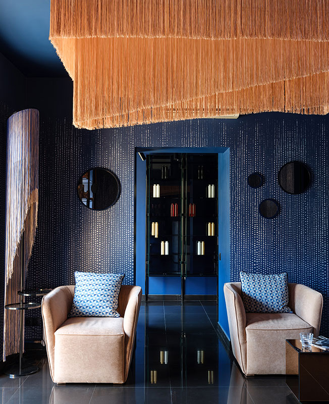 На создание пространства дизайнеров вдохновила стилистика 60-70-х годов с изобилием декоративных акцентов: бахрома, множество зеркал, разнообразные фактуры, градиенты и жизнерадостная цветовая палитра. В интерьере многократно повторяется форма круга.