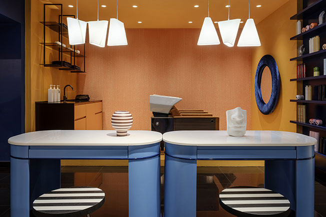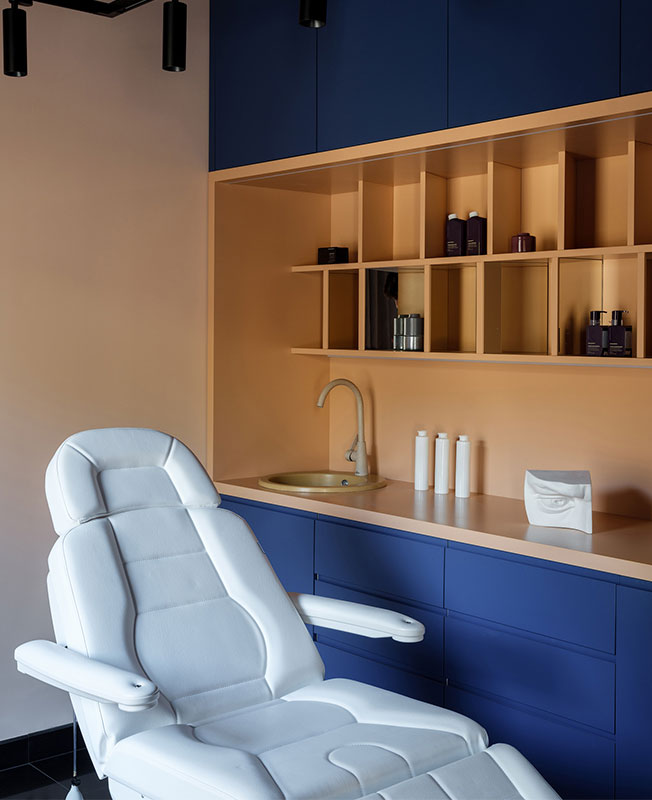 Для салона подобрали нетипичную смелую цветовую палитру с wow-эффектом. Потолок оформили в насыщенном синем оттенке, перекликающимся с темным полом. Цвет успокаивает, не раздражает, не угнетает. Контрастными акцентами доминирующему синему стал оранжевый оттенок в светильниках и креслах.