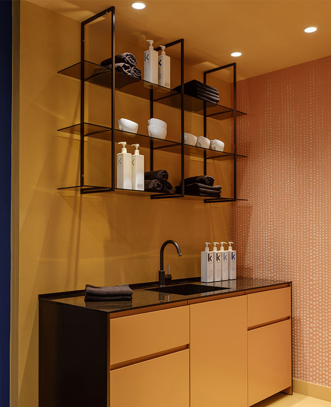 Функционально помещение 100 кв. метров разделили на две зоны. Первая — ресепшн, небольшое подсобное помещение и зал стилистов, вторая — косметический и педикюрный кабинеты, которые были отстроены буквально заново. Наибольшим изменением подвергся зал стилистов. Дизайнеры возвели в зоне мойки головы специальный подиум, который скрывает водопроводные коммуникации. Практически все предметы интерьера (за исключением профессионального оборудования) были созданы на заказ.