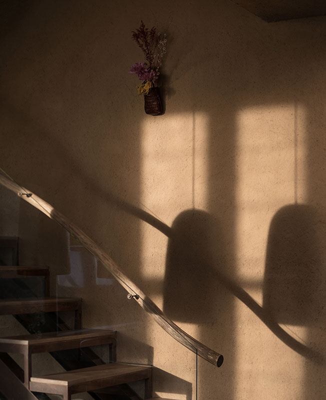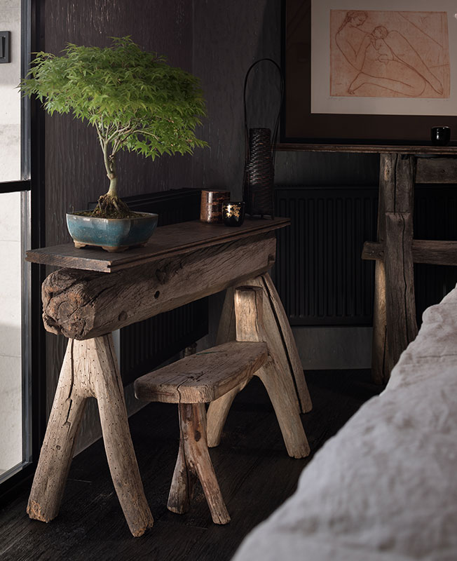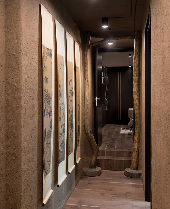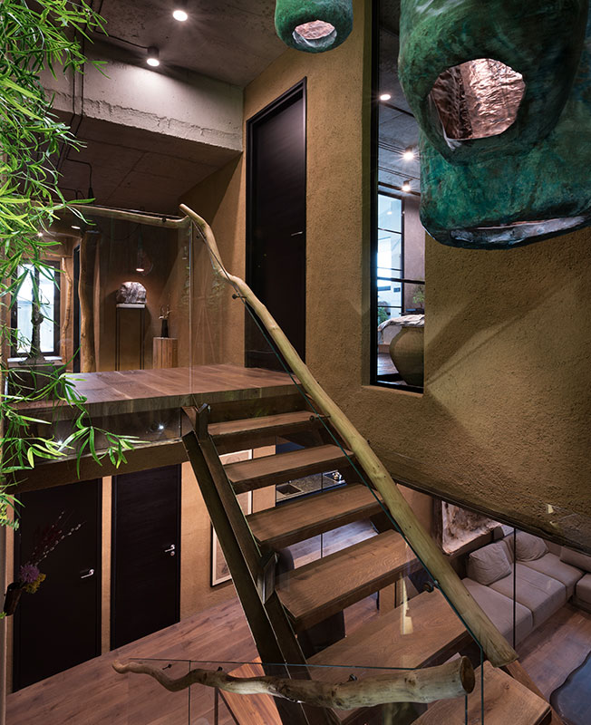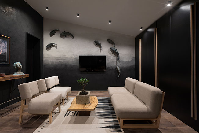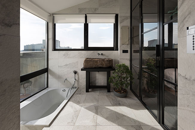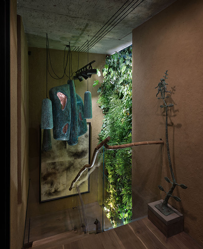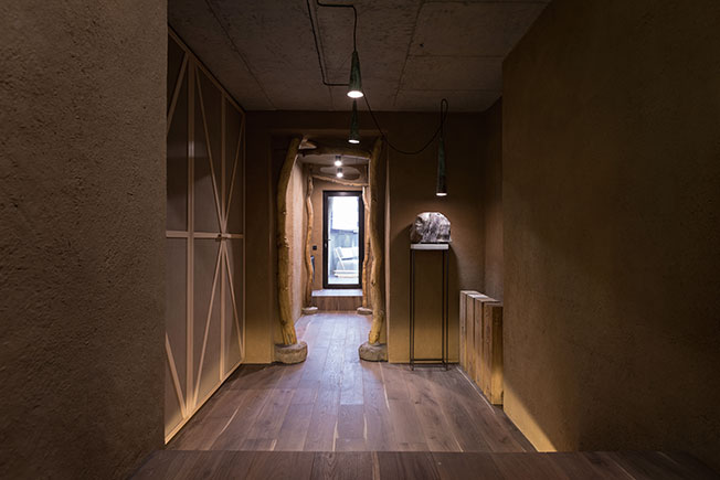 Концепция основана на японском принципе wabi-sabi с акцентом на предметы с подчеркнутым ощущением подлинности. Наполнение интерьера контрастирует с видом из окон — плотно застроенными городскими улицами.