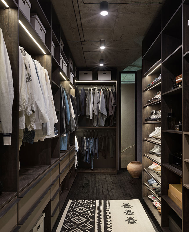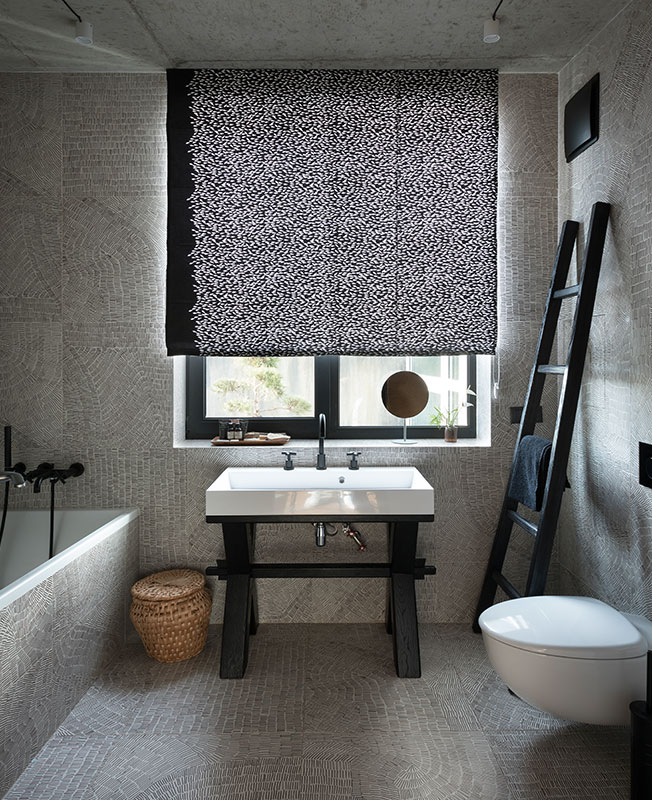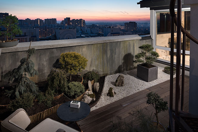 Двухэтажная квартира площадью 175 кв. метров помимо гостиной с обеденной зоной, кухни, спален с гардеробными включает также террасу (73 кв. метра) на крыше, исполненную в духе традиционного японского сада. Это пространство в очередной раз подчеркивает восточный характер апартаментов, при этом тканые ковры в интерьере указывают на украинскую культуру и ремесло.