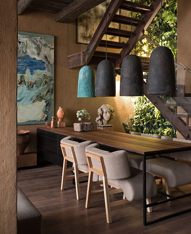 Пространство наполнено предметами современного искусства. В обстановке сделан акцент на крафтовость, предметы мебели и освещения в большинстве своем выполнены по дизайну Сергея Махно. Несмотря на нарочитый сельский вид, дом оснащен всеми удобствами по последнему слову техники. Цветовая палитра и грубые текстуры создают спокойную умиротворяющую атмосферу.
