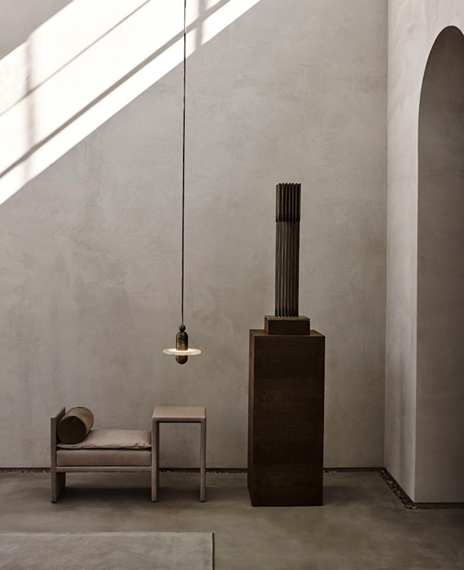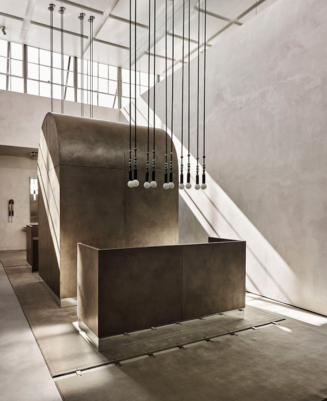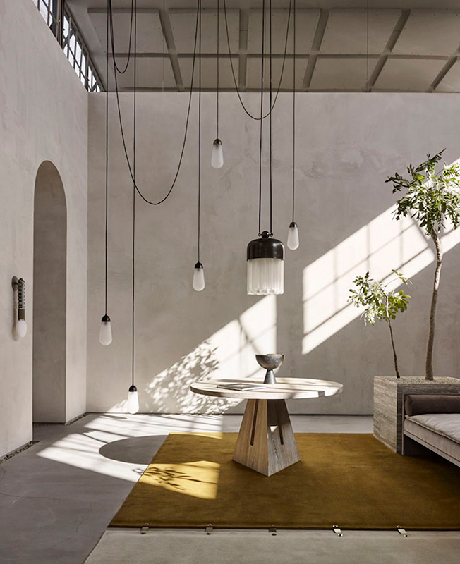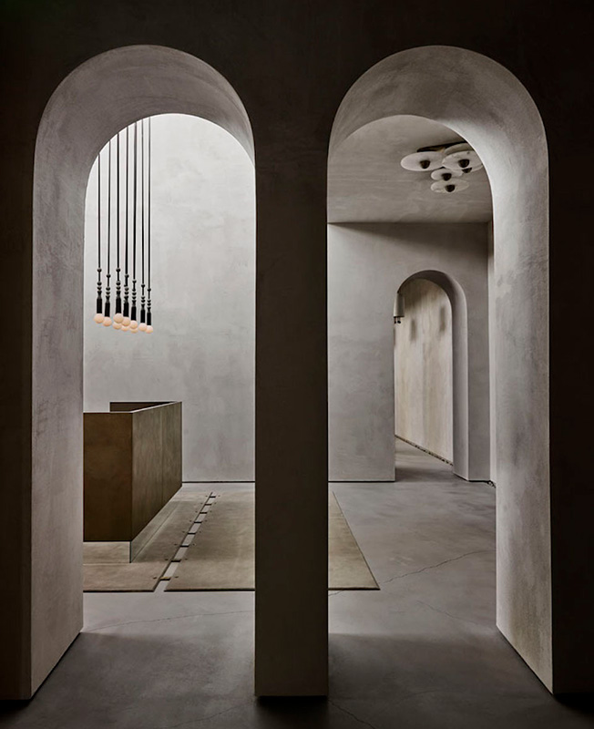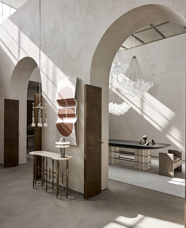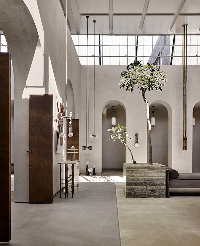 Наиболее заметно влияние де Кирико в обилии арочных проемов по всему шоу-руму. А также таинственной атмосфере, которую создает естественный свет, льющийся из ленточных окон с высоты 4,5 метров от пола. Солнце не только подсвечивает модели Apparatus, но и выявляет фактуру вручную оштукатуренных стен, подчеркивает теплые естественные тона отделки. Сдержанная сценография служит фоном для светильников, мебели и объектов декора из стекла и латуни, мрамора и замши.