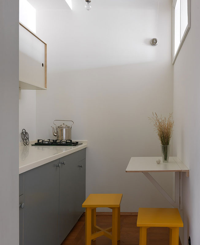 Кухня. Табуреты «Плебей» по эскизам А. Н. Машкова, студия Less. Кухонный гарнитур и складной столик выполнены из фанеры.