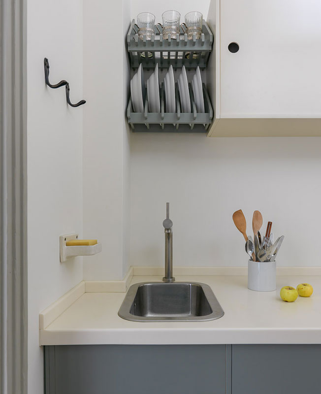 Специально для компактного пространства все предметы созданы как трансформеры. Вместо прикроватных тумбочек в спальне сконструированы специальные выдвижные полочки, стол на кухне складывается к стене, диван оборудован откидным подлокотником, который также может увеличивать длину спального места.