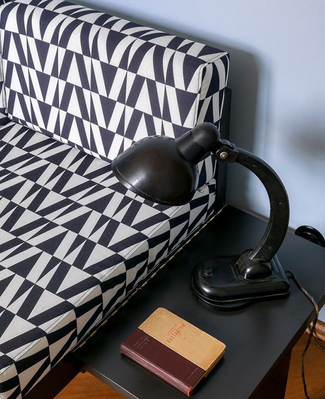 Фрагмент гостиной. Диван «Черный и красный квадраты», инженер А. И. Фрицлер. Узор обивочной ткани создан по мотивам рисунка Любови Поповой.